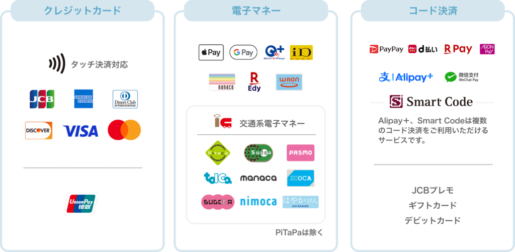 お支払いは、これまで通り現金のほか、クレジットカード電子マネーコード決済もご利用いただけます。